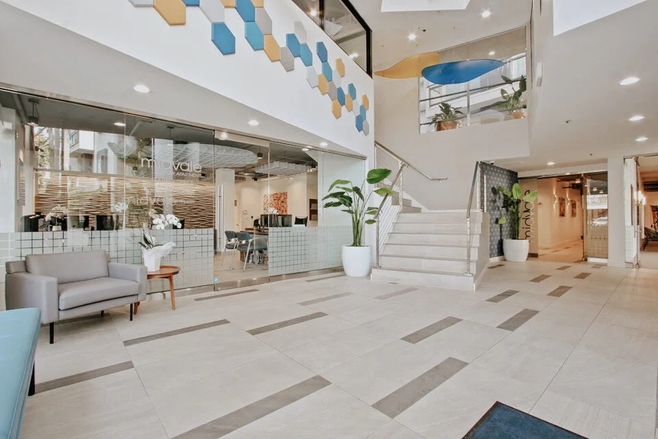 Located in Westwood Village, a remodel took place in the main lobby, leasing office and co-work space. Walking distance to UCLA, we took pride in the Bruins school colors and created a space unique to their students and residents around.
